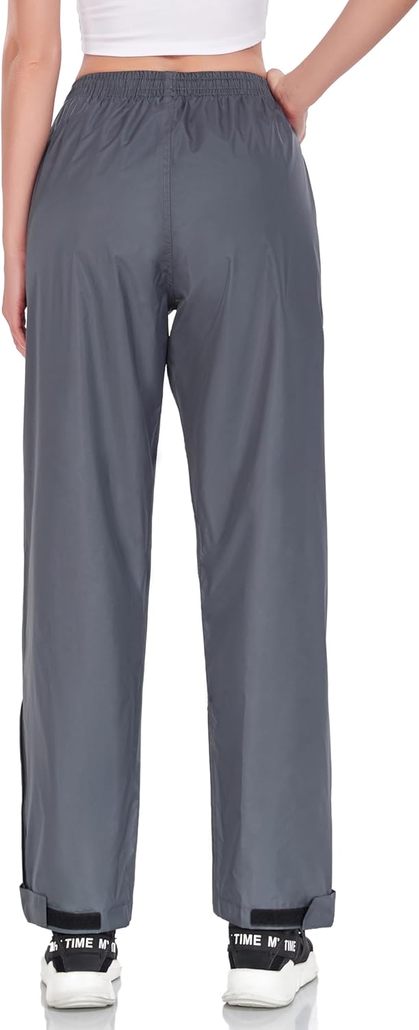 - Practical design: Womens rain pants waterproof with 2 zipper side pockets, built-in adjustable waist drawstring rain pants, elastic waist belt, to meet different waist circumferences, Full mesh lining, breathable and lightweight rain pants, keep you dry